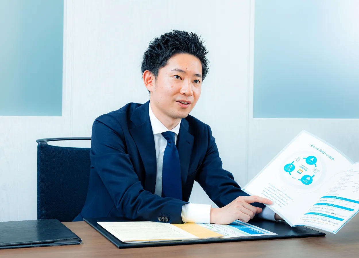 当社は銀行系仲介会社ですが、銀行からの紹介案件のみを扱うのではなく、約半分は独自で営業を行っている点が大きな特徴です。営業は新規開拓から契約まで、不動産取引のスキルをマルチタスクで身につけます。そのネットワークにはハウスメーカーの営業担当者をはじめ、弁護士や税理士など士業の方々もいます。また、契約書はもちろん、お客さまへの提出書類に関しては、何人もの社員が目を通して確認し、お客さまのご納得のいく取引につなげていく。良い意味で“細かすぎる”社風が根付き、あらゆるリスクを考え行動する。そんななかで、ハングリーに成長できる環境があります。