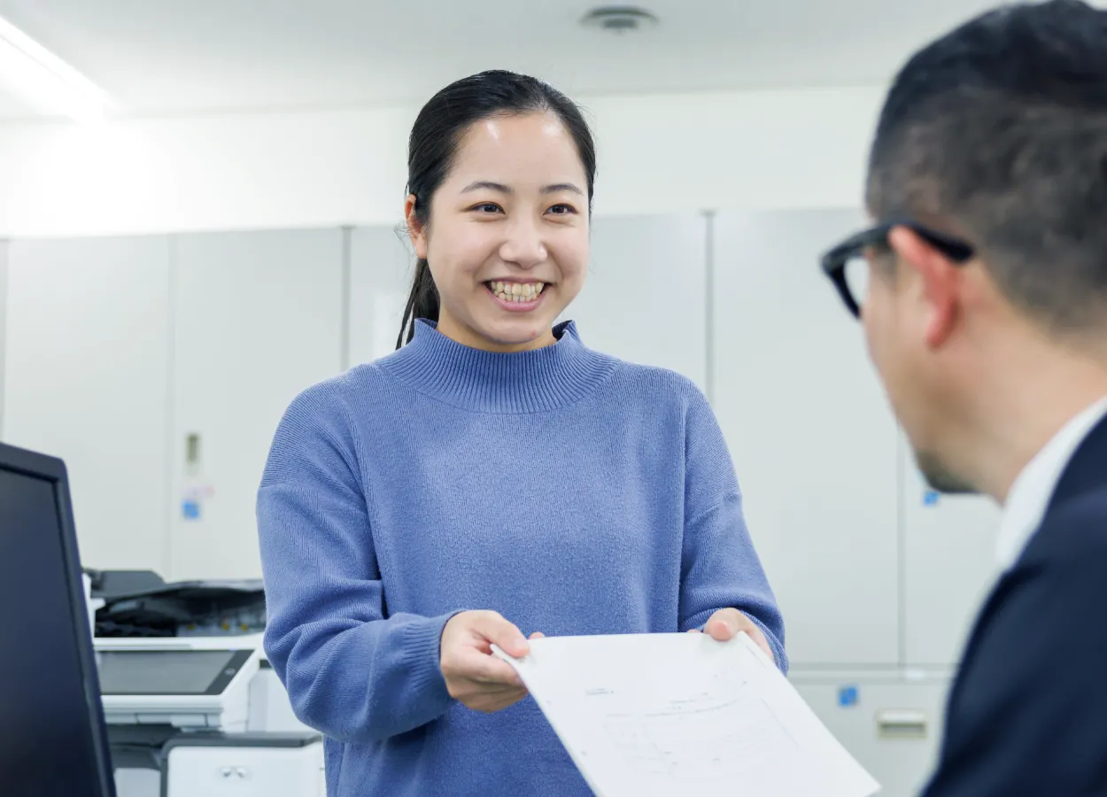 現在のポジションは、近畿圏では私のように営業から異動した人材は初めてですが、営業経験がそのまま活かせています。もともと営業時代から事務処理は得意な方で、そのスキルを営業アシスタントで役立てられるのは嬉しいです。タイトなスケジュールの契約案件を営業に代わって調査・書類の作成を担当することや、契約日が迫った案件が営業の体調不良で進捗できなくなっていた時は重要事項説明書、売買契約書の作成依頼を1日で完成させたこともあります。やはり営業経験のある自分にしかできないサポート力を発揮できた時は達成感がありますね。また、希望の納品日より早く書類を渡したことにより、「スケジュールを前倒しできた」と感謝された時や、「田中さんが調査・作成した案件は再調査が必要ない」と言ってもらえた時は、営業から信頼されていることを実感できて、とても印象に残っています。